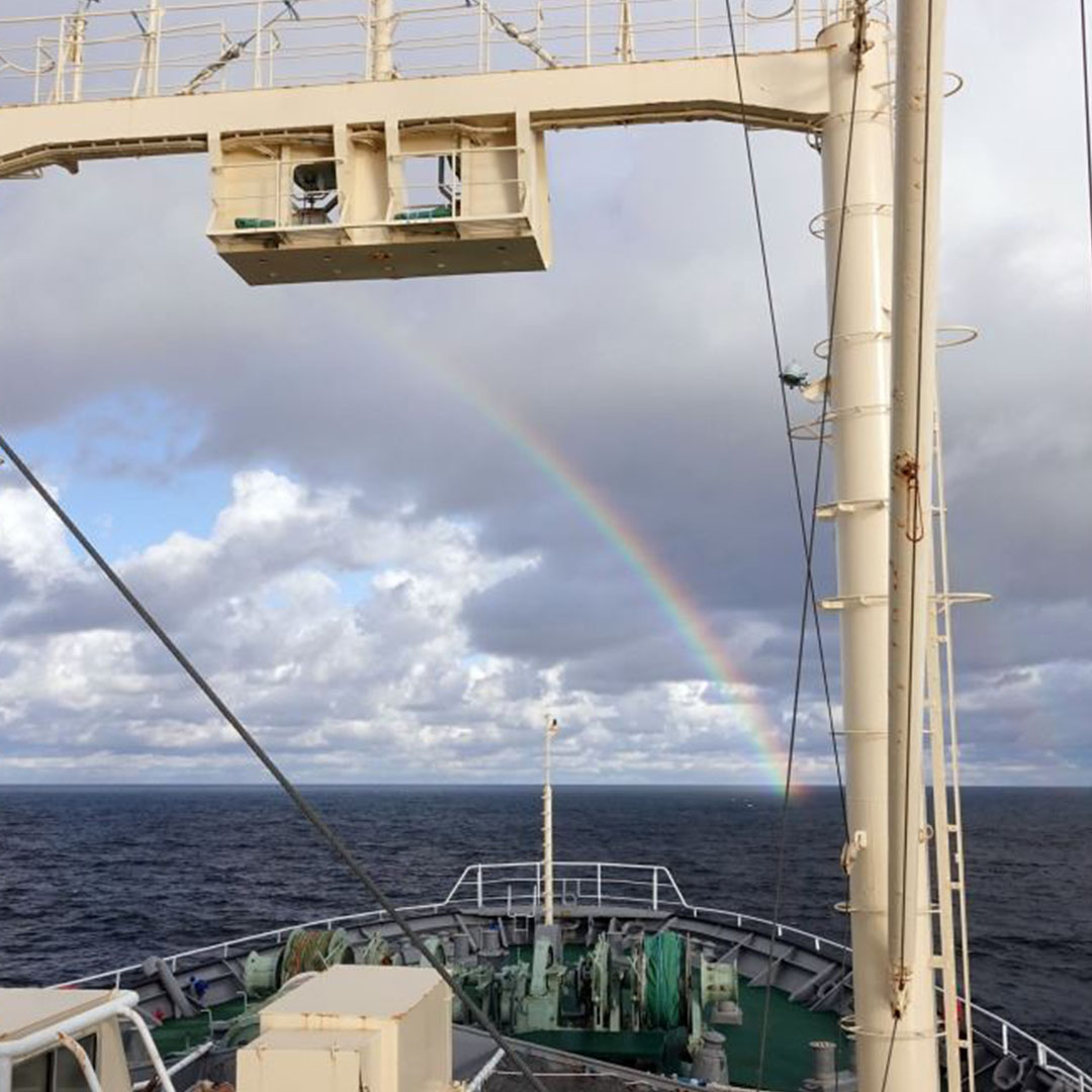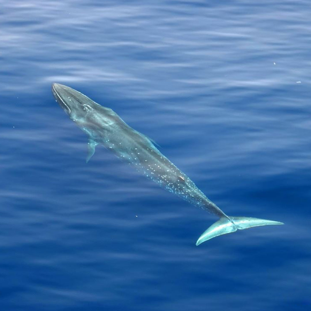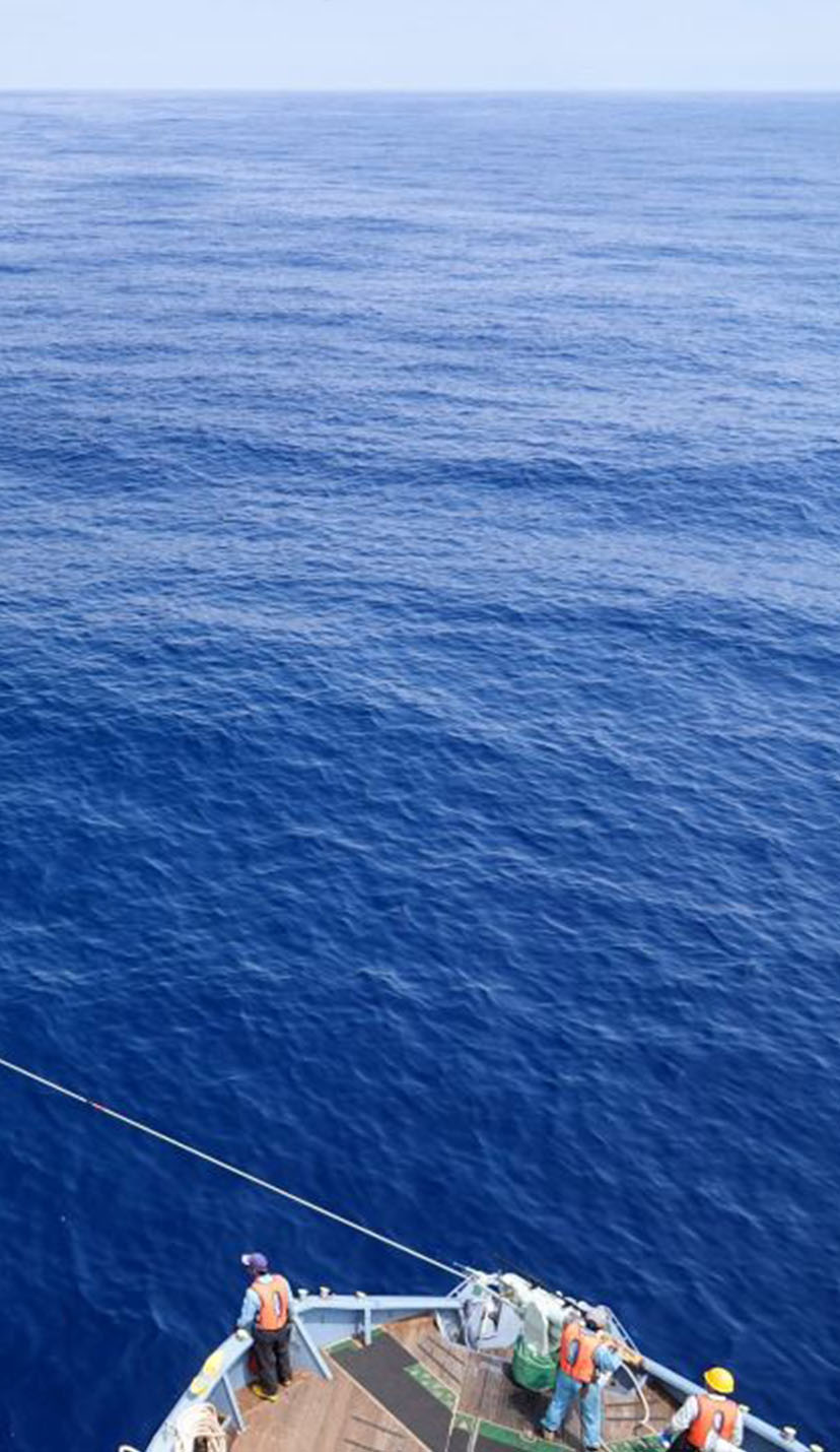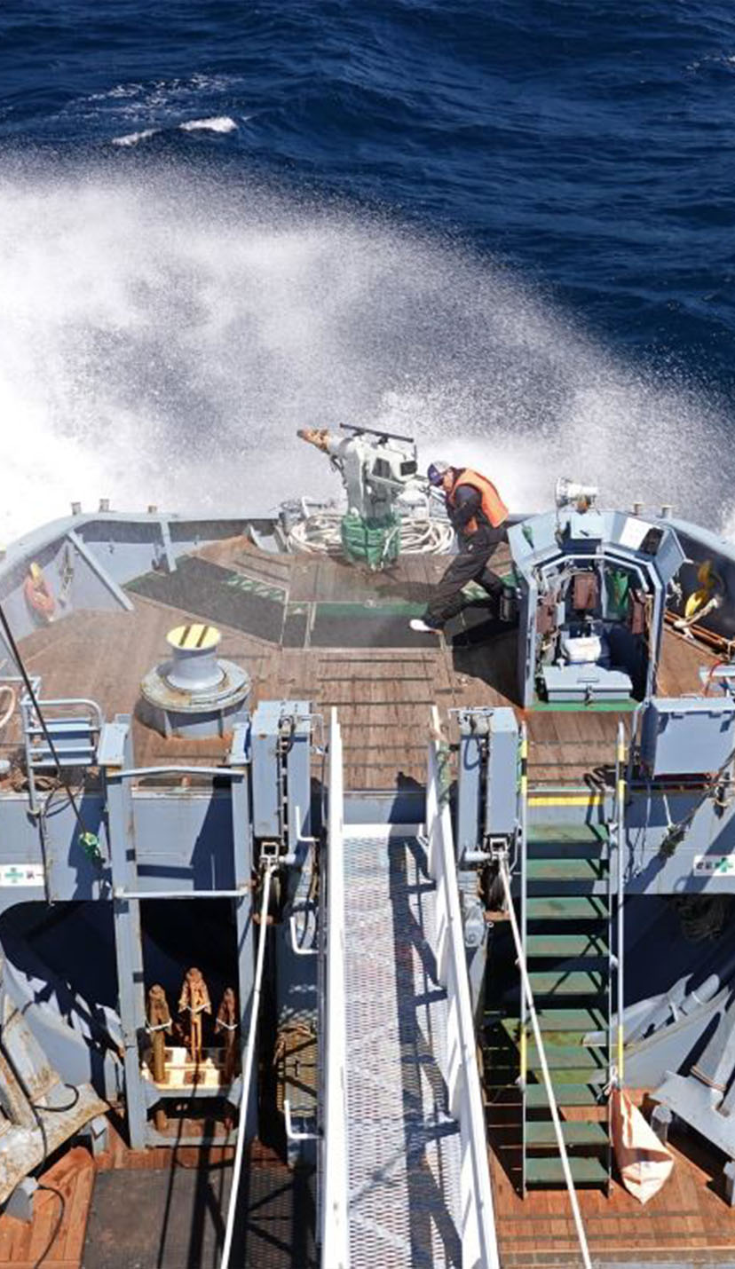 鯨類の資源量を推察するための目視調査や、生物学的解明を目的とした生物調査などに取り組んでいます。また、IWC(国際捕鯨委員会)との共同調査も行っています。目視調査は、日本周辺の海域から北太平洋、南極海など幅広い海域で実施。鯨群を発見次第、鯨体の形状や噴気によって鯨種を判定し、群の頭数や気象・海象の情報もあわせた包括的なデータを収集しています。調査を通じて得られた科学データや生物学的データはIWCに提出することで、鯨類資源の管理に貢献しています。